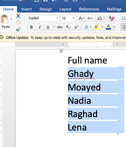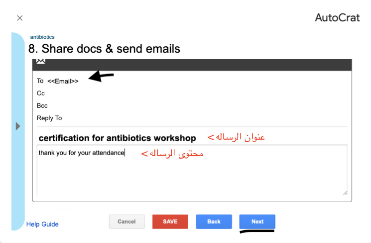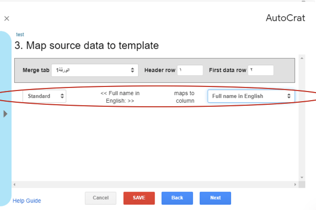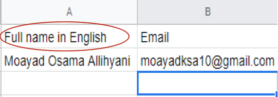 ٥-تكون الشهادة في الدرايف بصيغة ورد أو بور بوينت ندخل عليها ونضيف الرمز <<Full name in English>>بدون مسافات نضيفه محل ما نبغا الاسم يكون موجود اخترنا full name in English  عشين قائمة الأسماء في الإكسل موجودة بنفس الاسم لازم نركز أنو نفس الاسم بالضبط موجود في الإكسل كذا كما هو موضح في الصورة ونحفظها بعدين نخش على الإكسل وبعدين الخاصية ونكمل ونختار الفورم حقنا