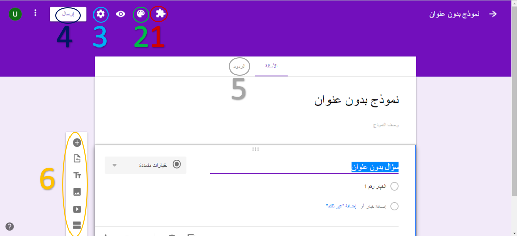 5- من هنا نعمل إضافة سؤال وتحديد طريقة السؤال والخيارات وإضافة قسم جديد (صفحة جديدة) واضافة صور ومقاطع